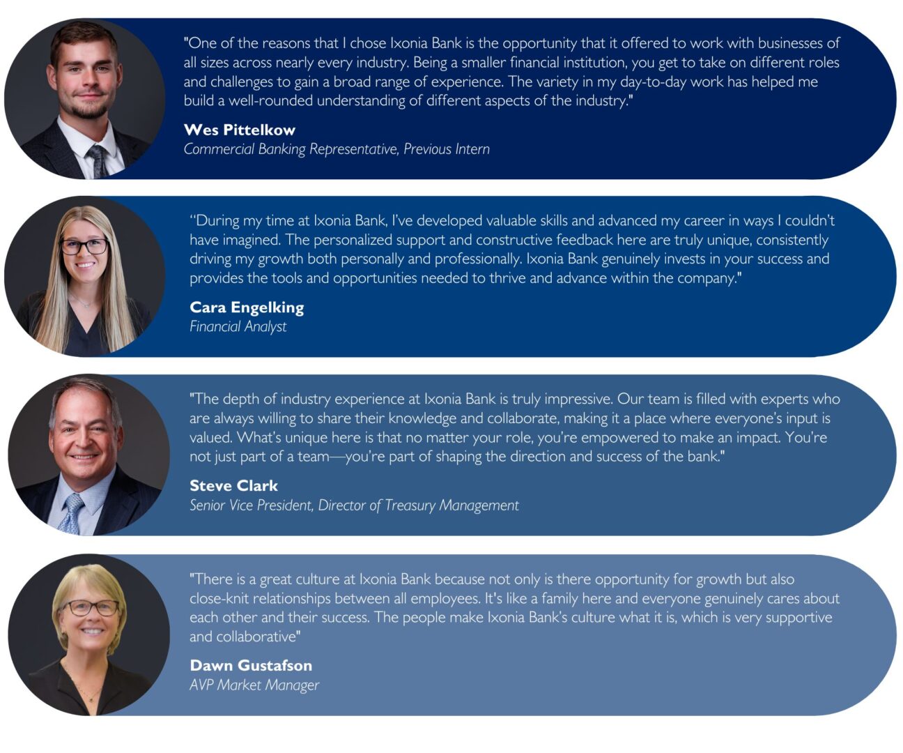 Why Ixonia Bank?Deep Industry ExperienceBenefit from our extensive expertise and knowledge in the industry, ensuring you learn from the best. Company CultureJoin a collaborative and supportive environment where teamwork and respect are at the core of everything we do. Advancement OpportunitiesWe provide numerous opportunities for professional growth and promotion to help you achieve your career goals. You Make a DifferenceAt Ixonia Bank, everyone counts. Make an impact in your role and the community. |
